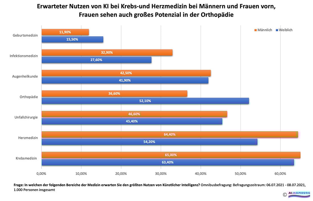 Auffällig sind zwei Unterschiede zwischen Männern und Frauen. Männer haben im Vergleich hohe Hoffnungen bei der Herzmedizin, das kann daran liegen, dass mehr Männer an Herzkrankheiten erkranken als Frauen (die allerdings häufiger an Herzkrankheiten sterben als Männer). Frauen erwarten im Vergleich einen höheren Nutzen von Künstlicher Intelligenz für die Orthopädie. Hier kann ein Zusammenhang dazu bestehen, dass Frauen statistisch häufiger unter Rücken und Nackenschmerzen leiden als Männer.