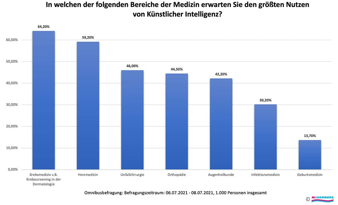 Bei aller Skepsis richten sich auch viele Erwartungen auf den Nutzen Künstlicher Intelligenz. Die Befragungsergebnisse zeigen, dass die höchsten Erwartungen in die Krebsmedizin gesetzt werden, etwas mehr als 64 % der Befragten haben sich so geäußert. Die Herzmedizin folgt mit knapp 59 %. Bei Unfallchirurgie und Augenheilkunde haben noch 46-42 % positive Erwartungen. Geringer sind die Zahlen für die Infektionsmedizin und Geburtsmedizin.