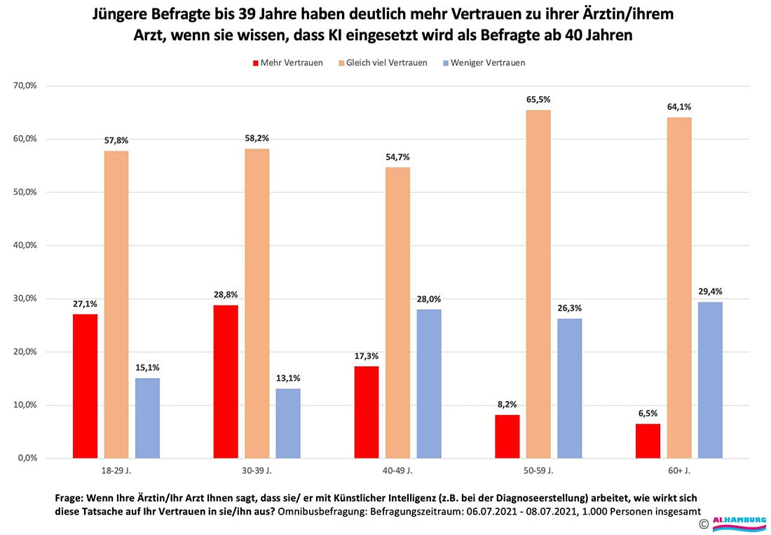 Die Befragungsergebnisse zeigen, dass die Medizin ein Akzeptanzproblem bei der Anwendung von Künstlicher Intelligenz hat. Es gibt keine grundsätzliche Ablehnung, denn die Mehrheit ist in ihrem Vertrauen in Ärztinnen und Ärzte durch die Verwendung von Künstlicher Intelligenz unbeeinflusst. Aber es ist eine Tendenz. Vor dem Szenario, dass Künstliche Intelligenz in einer Reihe von neuen Krebstherapien ein wichtiger Baustein ist, und diese oft lebensbedrohliche Krankheit im Alter zunimmt, ist die höhere Skepsis im Alter ein Problem.