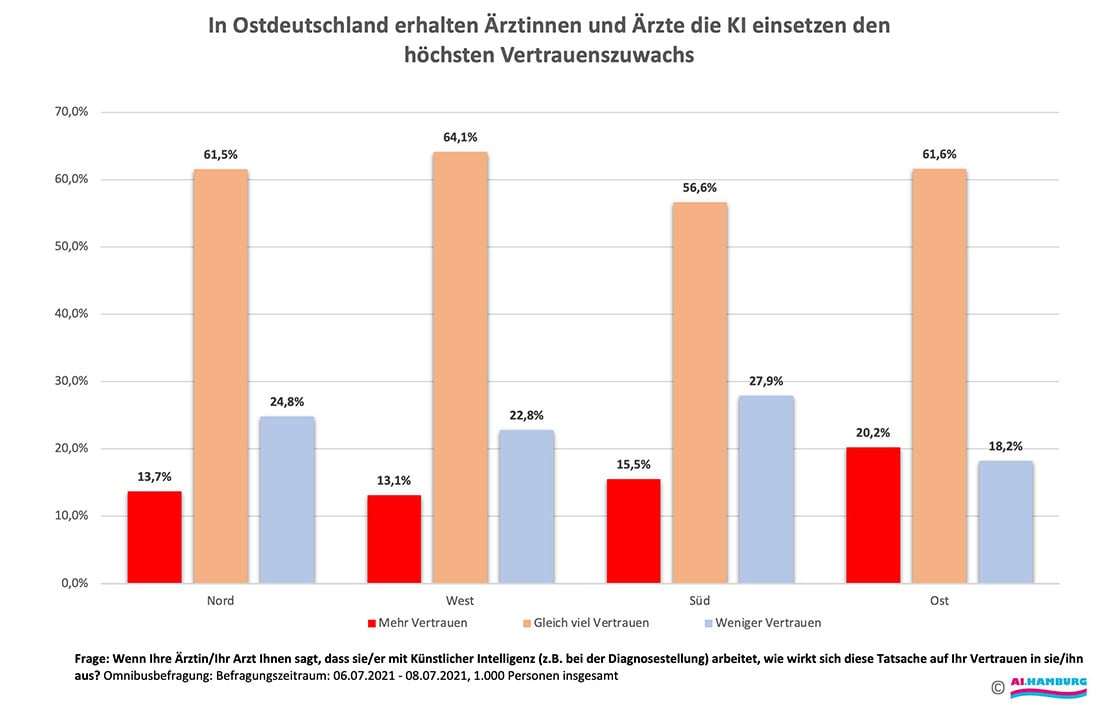 Schaut man sich die Landkarte an, dann bietet sich eine Überraschung. Nur in Ostdeutschland überwiegt das zusätzliche Vertrauen in die Künstliche Intelligenz. Im Süden, im Westen und im Norden sind die Skeptiker stärker vertreten, als die, die bei Verwendung von Künstlicher Intelligenz einen Vertrauensbonus geben.