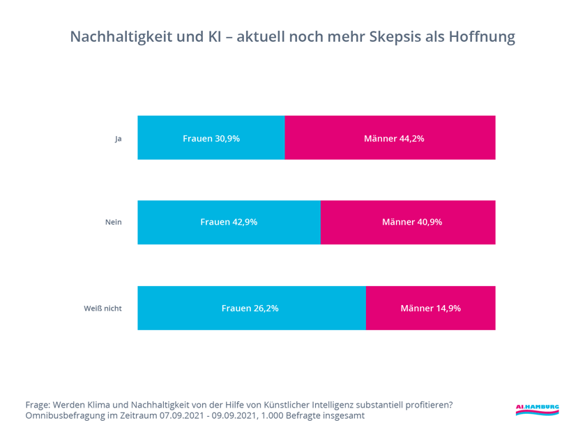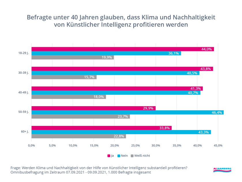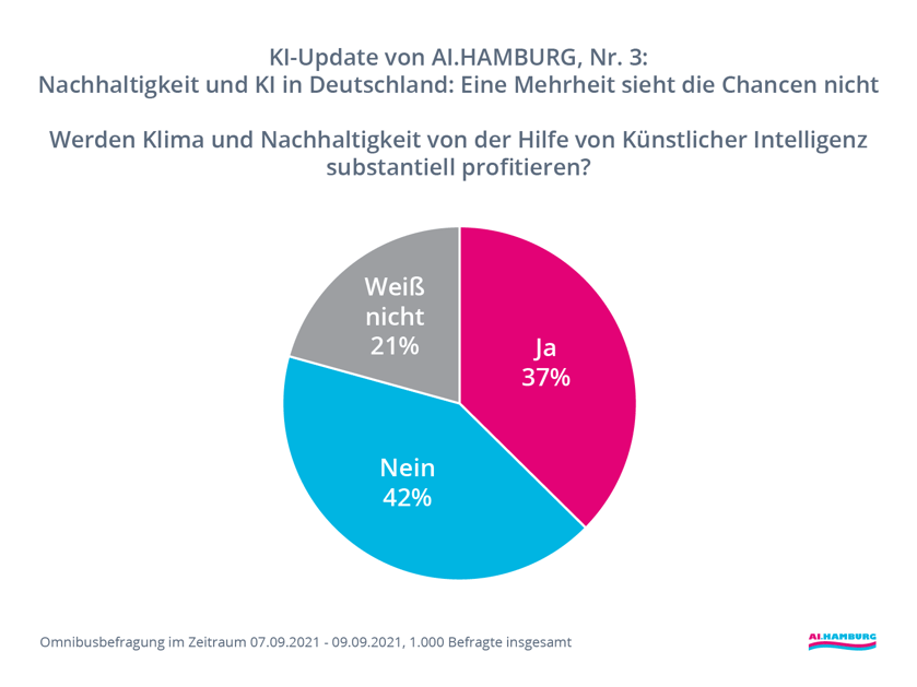 Von den Menschen in Deutschland, die wir befragt haben, glauben nur 37%, dass Klima und Nachhaltigkeit von Künstlicher Intelligenz profitieren werden. 42% glauben dies nicht. Man könnte sagen, dass das eine ernüchternde Erkenntnis ist. Gut, 21% sagen, dass sie es einfach nicht wissen. Aber das macht es auch nicht besser. Die Künstliche Intelligenz spielt für die Mehrheit der Menschen aktuell keine Rolle, wenn es um ein nachhaltigeres Leben und Wirtschaften geht.